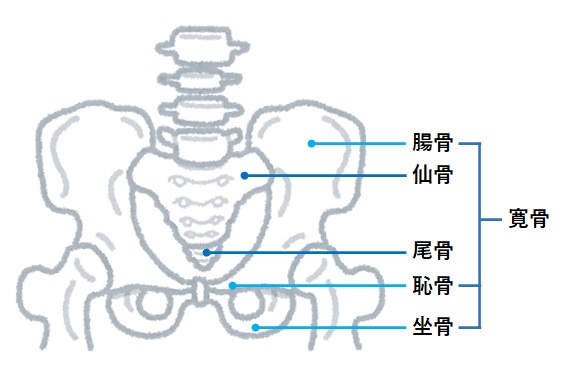 骨盤は腰部分をつくる骨格のことで、寛骨(腸骨、坐骨、恥骨)、仙骨、尾骨によって構成されています。